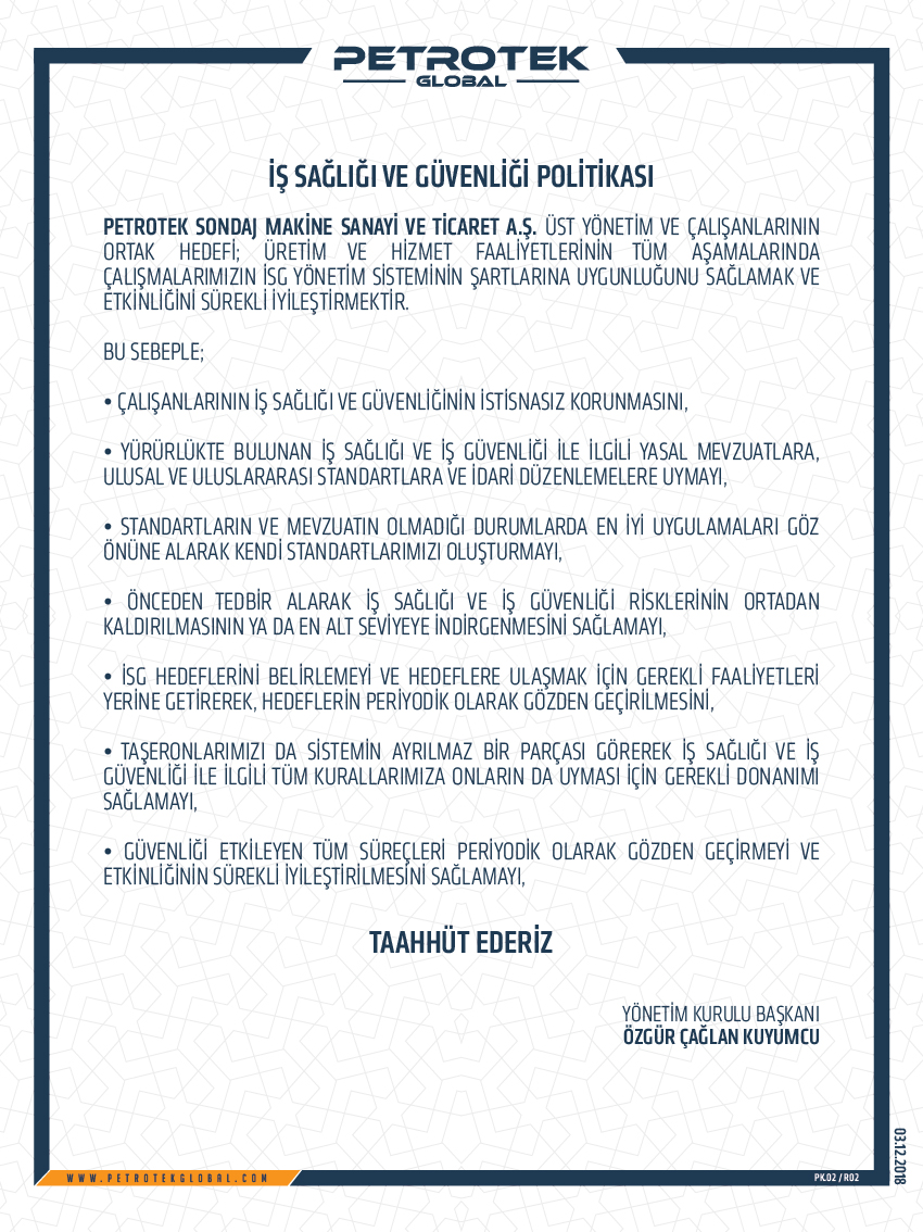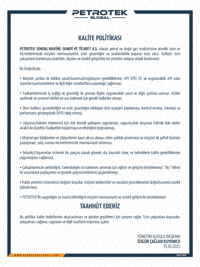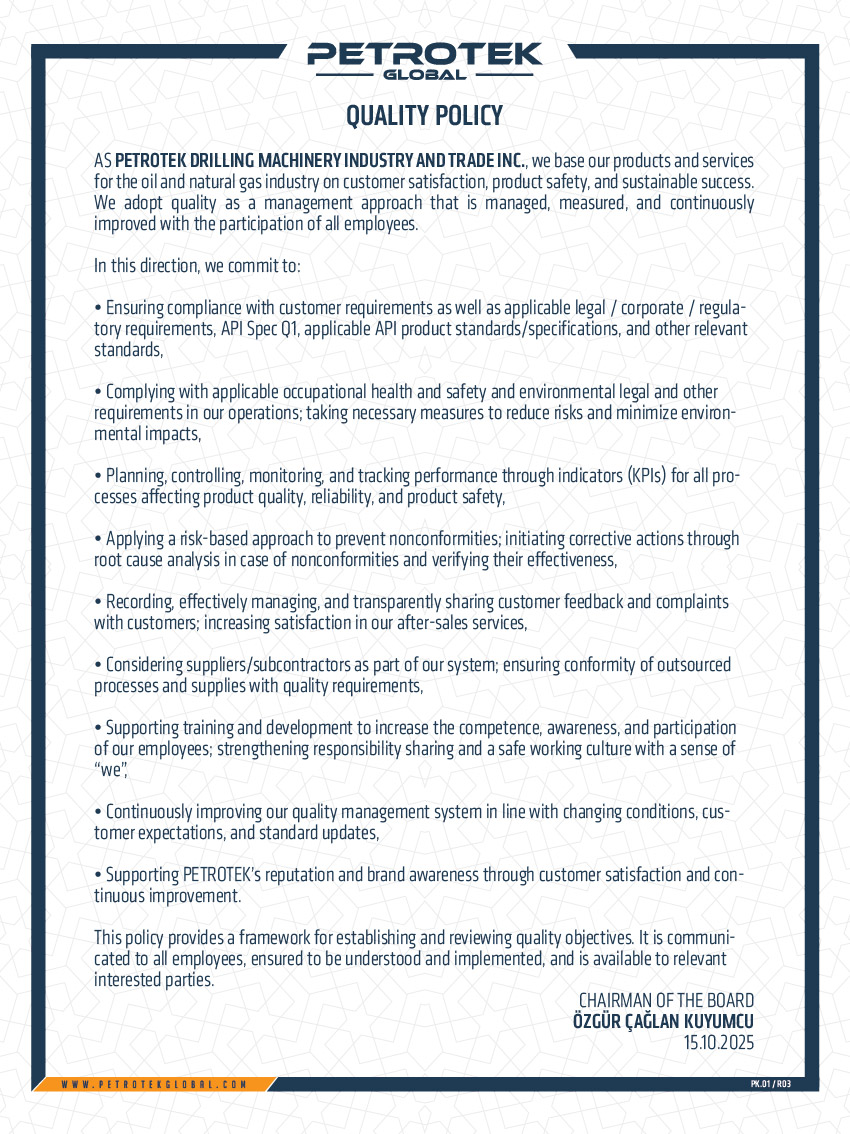 We greatly value work safety, quality assurance and reliability of our products. As a result of this understanding, the duty to comply with our Quality Management System extends to each and every Petrotek facility and employee, as well as the terms of our working agreements with our subcontractors and suppliers.